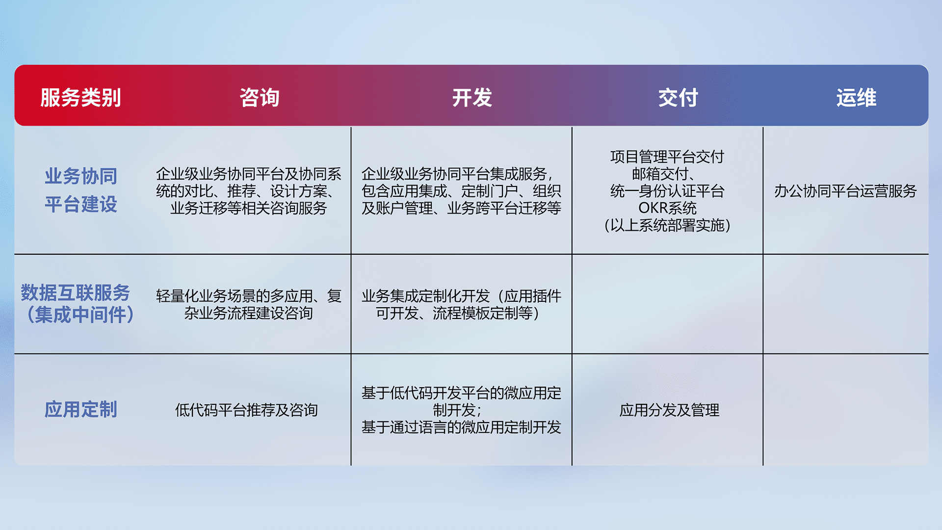 针对钉钉、、企微、、、IDaas等平台级产品提供产品的规划、、方案、、交付、、定制化开发等服务,,,,实现如统一协同办公、、智能客户服务、、、、混合会议管理、、、、智能数据查询、、等业务场景,,,实现数字化转型。。
